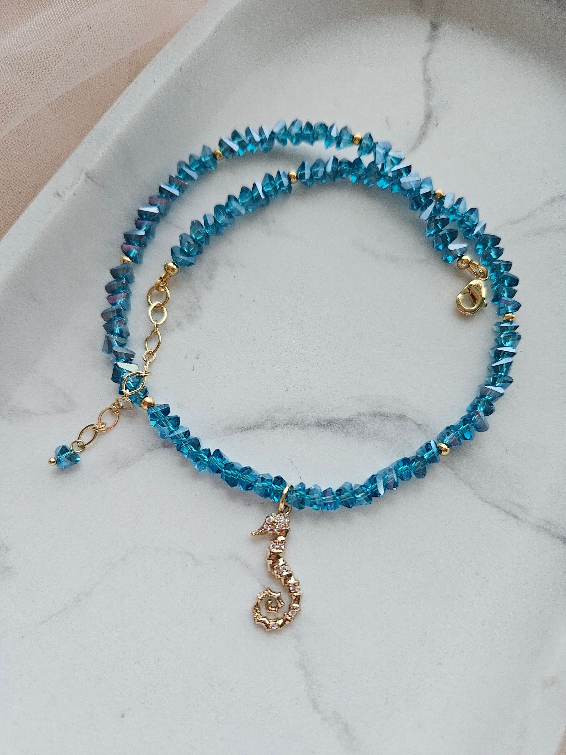 Halssmykke er 40+5 cm forlengelseskjede, glassperler er 0,6 mm, anheng er 0,9x2,5 cm.